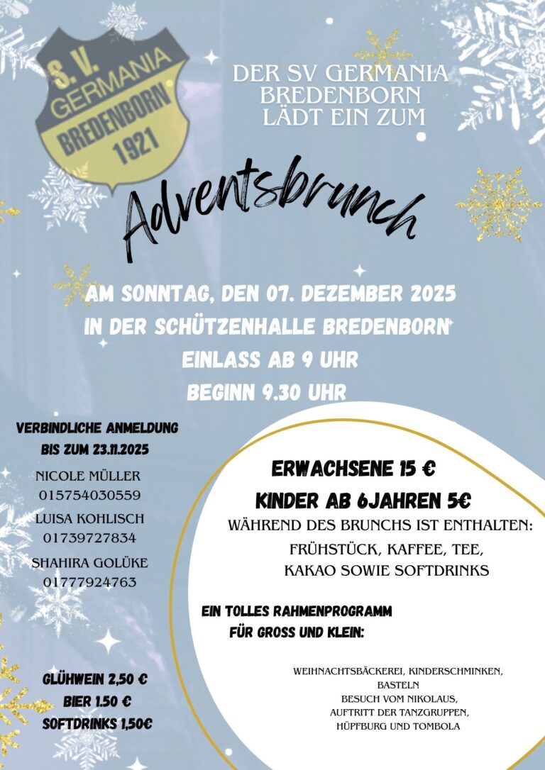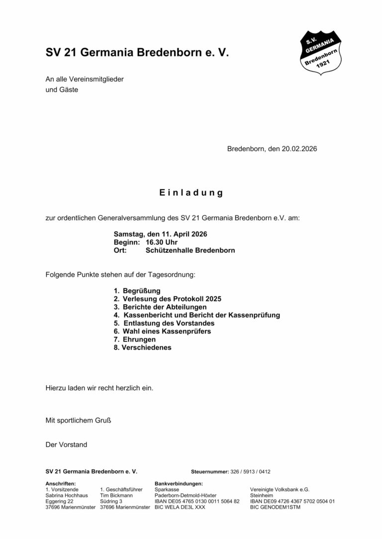 An alle VereinsmitgliederDie ordentliche Generalversammlung des SV 21 Germania Bredenborn e.V. ist am: Samstag, den 22. Februar 2025 Beginn: 17.00 Uhr Ort: Schützenhalle Bredenborn Folgende Punkte stehen auf der Tagesordnung: 1. Begrüßung 2. Verlesung des Protokoll 2024 3 Bericht der…