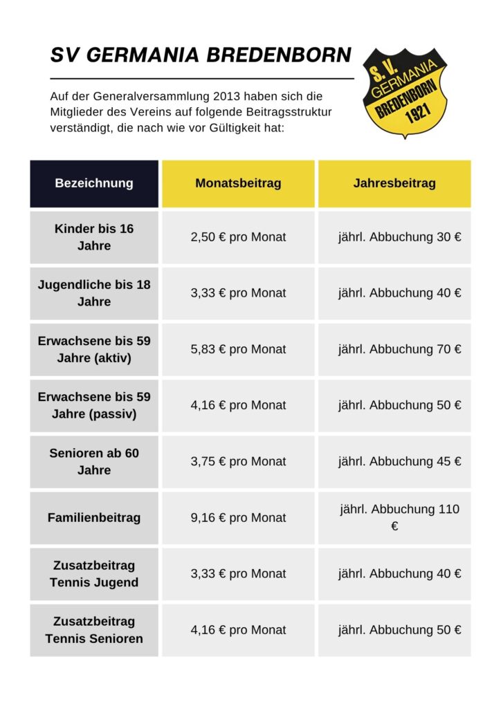 Neue Mitglieder, die im ersten Halbjahr eines Kalenderjahres in den Sportverein eintreten, zahlen den vollen Jahresbeitrag. Bei Eintritt ab dem 01.07. wird der halbe Beitrag berechnet. Regelmäßiger Sepa-Einzugstermin ist der 6. März. Kündigungen werden stets zum Ende eines Kalenderjahres wirksam.